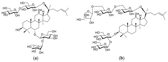 - Yang, W.; Hu, Y.; Wu, W.; Ye, M.; Guo, D. Saponins in the enus Panax L. (Araliaceae): A systematic review of their chemical diversity. Phytochemistry 2014, 106, 7–24. [Google Scholar] [CrossRef] [PubMed]