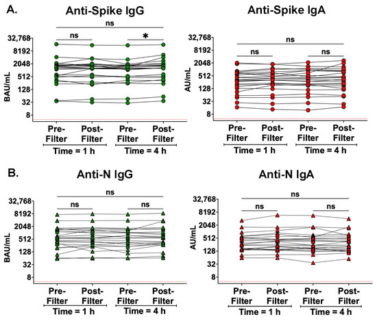 There were no differences between pre- and post-filter serum antibody levels during treatment with the Seraph 100. Antibody levels were measured both entering and then exiting the Seraph 100 filter at two time points: time = 1 hour (h) and time = 4 h following filter application. Serum antibody levels from participants with samples from all four timepoints, i.e., at 1 h pre/post filter and at 4 h pre/post-filter (n = 23), were analyzed using Friedman’s test with Dunn’s test for multiple comparisons. (A) Anti-spike IgG and IgA levels, and (B) anti-N IgG and IgA levels. The red dotted line represents the lower limit of quantitation for this assay; ns, not significant; * p < 0.05.