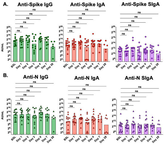 Mucosal antibody levels were not affected by treatment with the Seraph 100 Filter. (A) Mucosal antibody levels of anti-spike and (B) mucosal antibody levels of anti-N IgG, IgA, and SIgA at baseline (BSL, n = 14), day 1 (n = 13), day 2 (n = 12), day 3 (n = 13), day 4 (n = 13), day 7 (n = 10), and day 28 (n = 6) from samples collected during the study. The red dotted line represents the lower limit of quantitation for this assay. Mucosal antibody levels were compared to baseline levels using Kruskal–Wallis analysis with Dunn’s multiple comparison test; ns, not significant.
