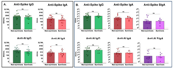 To assess if there were differences between antibody levels of nonsurvivors and survivors, we compared the peak serum antibody levels between these groups (Figure 4). No differences were observed between nonsurvivors and survivors with regards to peak serum anti-spike IgG or IgA, or peak serum anti-N IgG or IgA, antibody levels (Figure 4A). Similarly, no significant differences were observed between survivors and nonsurvivors with respect to peak mucosal anti-spike or anti-N IgG, or peak mucosal IgA or SIgA, antibody levels (Figure 4B).