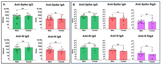 We compared the peak serum (Figure 5A) and mucosal (Figure 5B) antibody levels between males and females in the cohort. No sex-associated differences in either serum or mucosal peak antibody levels were observed.