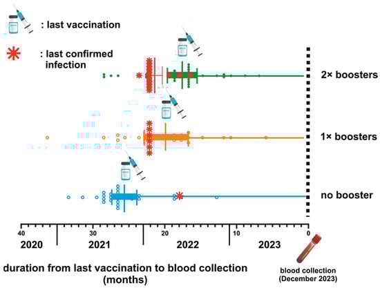 - Matsumoto, N.; Sasaki, A.; Kadowaki, T.; Mitsuhashi, T.; Takao, S.; Yorifuji, T. Longitudinal antibody dynamics after COVID-19 vaccine boosters based on prior infection status and booster doses. Sci. Rep. 2024, 14, 4564. [Google Scholar] [CrossRef]