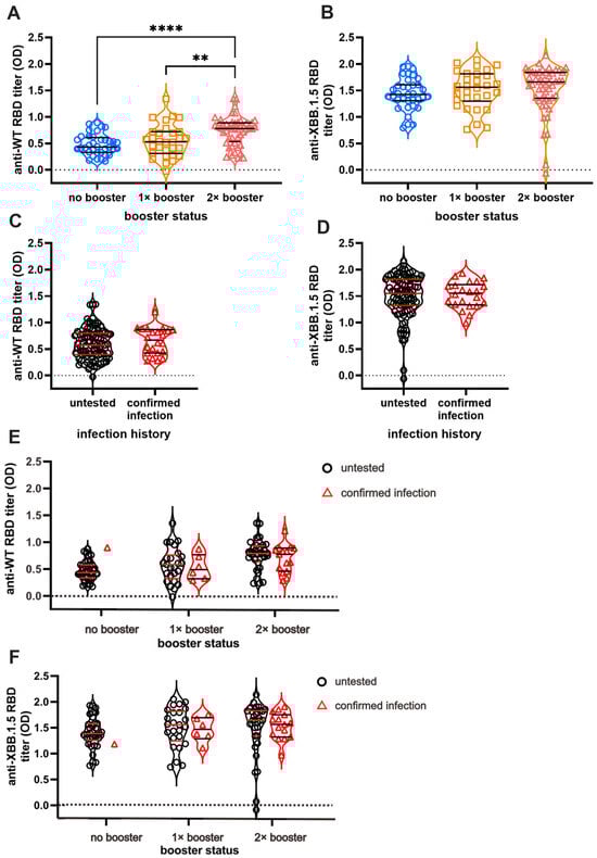 Indirect ELISAs were performed using commercially available, HPLC-verified Wild-Type (WT) and XBB.1.5 RBD proteins as antigens (Sino Biological, Kawasaki City, Japan; #40591-V08H for WT and #40592-V08H146 for XBB.1.5). The antibody titers are expressed as the optical density (OD) of the serum samples. As previously described, the same ELISA procedure was employed to measure the ODs, reflecting each sample’s antibody (Ab)-binding capability to the respective antigens [15,16]. The 96-well microplates (Corning, Sakai, Japan, #3590) were coated with 0.2 μg/mL of either SARS-CoV-2 WT or the XBB.1.5 antigen and incubated overnight at 4 °C. Before incubation with the sera samples, the plates were blocked with 1% bovine serum albumin (BSA) in PBS (pH 7.4) for 1 h and then washed with PBS-T. The sera were diluted 1:100 in PBS containing 1% BSA. After incubation with sera for an hour, the plates were washed and then incubated with horseradish peroxidase (HRP)-conjugated monoclonal antibodies recognizing an Fc domain of human IgG for another hour. After incubation, the plates were rewashed, 100 μL/well of the substrate was added to each well, and the plates were incubated for 30 min at room temperature for color development. The absorbance was measured at 414 nm using a microplate reader, with results expressed as the Ab titers.