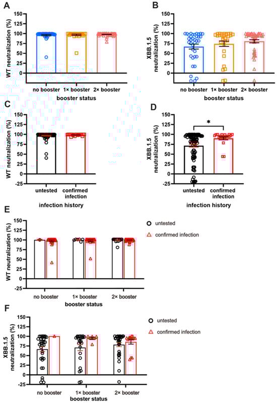 A comparison of long-term neutralization capacity (NC). (A) Almost-complete NC against WT in all subjects. (B) Comparison of NC against XBB.1.5, with double booster (DB) groups having the highest NC compared to no booster (NB) and single booster (SB) groups. (C) Individuals with breakthrough infection (BTI) exhibit comparable NC against WT compared to the untested group. (D) Individuals with BTI demonstrate higher NC against XBB.1.5 than untested groups. (E,F) The effect of booster doses on WT NC and XBB.1.5 NC among individuals with confirmed BTI and those without BTI. Serum NC was measured using ONE-Glo EXTM Luciferase Assay System. Individual values are shown with bars that represent the means and horizontal lines that represent SEM. Statistical analyses were performed using the Mann–Whitney U test, * p < 0.05.