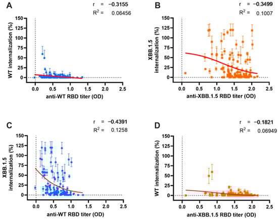 Correlation between antibody (Ab) titer and either neutralization capacity (NC) or cross-neutralization. A similar weak relationship between serum Ab titers and their respective NC was observed for both Wild-Type (WT) (blue dots) (A) and Omicron XBB.1.5 (orange dots) (B). Cross-correlation analysis between WT Ab titers and Omicron XBB.1.5 internalization (C); and Omicron XBB.1.5 Ab titers and WT internalization (D). Serum Ab titers were measured using indirect ELISA and are expressed as optical density at 414 nm, while serum NC was measured with the ONE-Glo EX™ Luciferase Assay System. Red lines depict the non-linear regression model between variables.