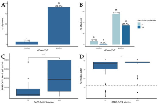 Humoral immunity in patients after liver transplantation. (A) Qualitative results of the cPassTM sVNT; cutoff: 30% inhibition. (B) Comparison of the cPassTM sVNT results between patients with or without a history of SARS-CoV-2 infection. (C) Detection of anti-S IgG levels in patients in with and without a history of SARS-CoV-2 infection by the Abbott CMIA. (D) Inhibition of RBD-hACE2 binding by sera of patients with and without a history of SARS-CoV-2 infection as measured by cPassTM sVNT; cutoff: 30% inhibition. Mann–Whitney U test was used to evaluate differences between groups. ** p < 0.01; *** p < 0.001.