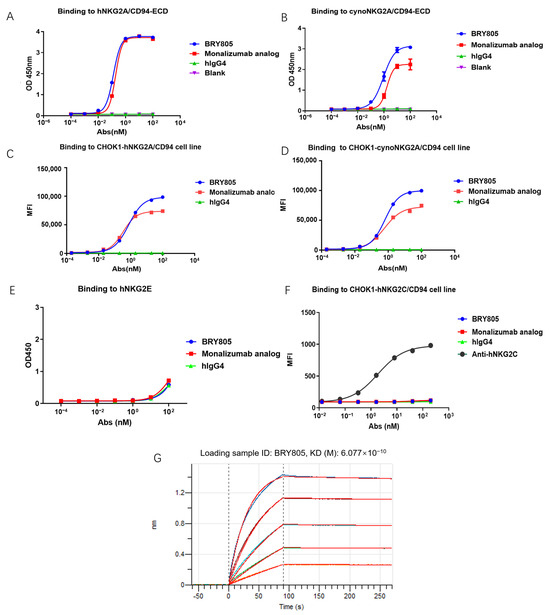 Binding activity of BRY805 to proteins and cells was assessed through various methodologies. (A) The interaction of BRY805 with human NKG2A/CD94 extracellular domain (ECD) was quantified using enzyme-linked immunosorbent assay (ELISA). (B) The binding of BRY805 to cynomolgus NKG2A/CD94 ECD was evaluated via ELISA. (C) Flow cytometry analysis demonstrated the binding of BRY805 to CHOK1 cells overexpressing human NKG2A/CD94. (D) The binding of BRY805 to CHOK1 cells overexpressing cynomolgus NKG2A/CD94 was also analyzed using flow cytometry. (E) ELISA was employed to determine the binding affinity of BRY805 to human NKG2E. (F) Flow cytometry analysis further revealed the binding of BRY805 to CHOK1 cells overexpressing human NKG2C/CD94. (G) Analysis of the binding kinetics of BRY805 to the extracellular domain of hNKG2A/CD94 was conducted using Bio-Layer Interferometry.