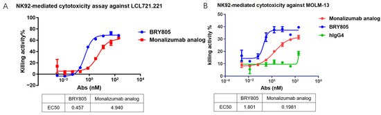 This study assessed the potential of BRY805 to enhance the cytotoxicity of NK92 cells against cancer cells. Both LCL721.221 B-lymphoblastoid cells and MOLM-13 myeloid leukemia cells are capable of expressing HLA-E, while NK92 cells exhibit high expression levels of NKG2A/CD94. Upon incubation with these cancer cells, NK92 cells demonstrated minimal cytotoxic activity, attributed to the interaction between HLA-E and NKG2A/CD94, which subsequently inhibited NK92 cell cytotoxicity. However, the introduction of BRY805 disrupted the binding between HLA-E and NKG2A/CD94, thereby enabling NK92 cells to effectively target and kill the cancer cells. Notably, BRY805 demonstrated superior potential in enhancing NK92 cell-mediated cytotoxicity compared to a monalizumab analog, exhibiting a tenfold lower EC50 (Figure 3).