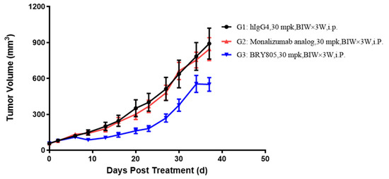 To evaluate the in vivo efficacy of BRY805, NCI-H1975 cells expressing HLA-E were subcutaneously injected into the flanks of huHSC-NCG-hIL15 mice. These mice are capable of supporting the reconstitution of human natural killer (NK) and T cells through the implantation of human hematopoietic stem cells (HSCs), resulting in a higher NK cell level compared to peripheral blood mononuclear cells (PBMCs) and providing a closer approximation to human biology. However, a limitation of this model is that more than one human HSC is required to reconstitute a sufficient number of mice in a single experiment, which may lead to variability in immune levels. Mice were administered treatments with either a human IgG4 isotype control, a monalizumab analog, or BRY805. As indicated in Table S1, on day 37, the mean tumor volume (mTV) for the isotype control group was 891.56 mm3. In comparison, the mTVs for the BRY805 and monalizumab analog groups were 550.38 mm3 and 845.04 mm3, respectively, with tumor growth inhibitions (TGIs) of 36.04% (p < 0.05) and 4.2% (p = 0.777). The administration of BRY805 resulted in a statistically significant reduction in tumor growth compared to both the human IgG4 isotype control and the monalizumab analog (Figure 6). Based on the tumor weight measurements on day 37 (refer to Table S2 and Figure S1), BRY805 administered at a dosage of 30 mg/kg demonstrated a statistically significant inhibitory effect on tumor weight increase, with a tumor growth inhibition rate of 36.64% (p = 0.014), in comparison to the negative control hIgG4 isotype. In contrast, the monalizumab analog at the same dosage did not exhibit a significant effect, with a tumor growth inhibition rate of −3.84%. Additionally, flow cytometry analysis of human immune cells from the peripheral blood of the mice revealed that the frequency of human CD16+ and CD8+ cells was elevated in mice treated with BRY805 compared to those receiving the hIgG4 isotype control (see Figure S3). These findings indicate that BRY805 demonstrates superior antitumor efficacy in vivo relative to the monalizumab analog. During the course of this experiment, no mortality was observed among the mice, and the rate of change in body weight did not differ significantly across the various treatment groups at the conclusion of this study (refer to Table S3 and Figure S2). This indicates that the administered drugs did not induce a significant reduction in body weight, suggesting that they were well tolerated by the mice.
