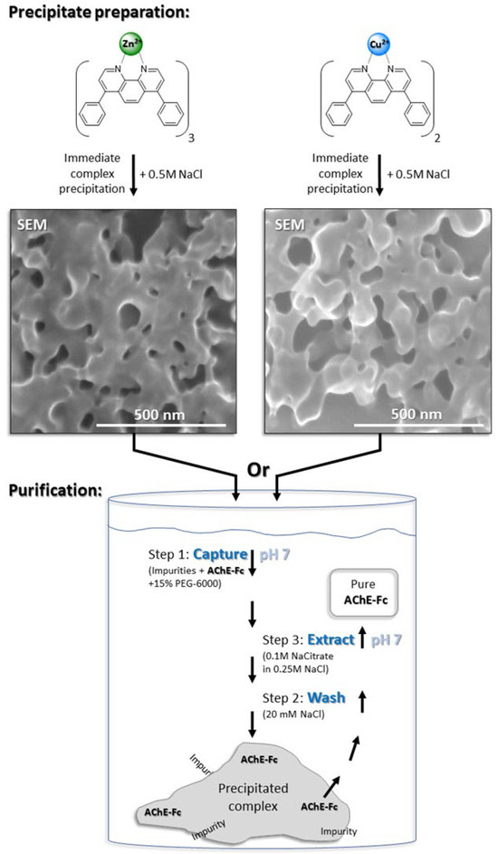 Illustration of the three-step purification protocol for AChE-Fc using [(batho):cation] complexes and 15% w/v PEG-6000. The aromatic chelator complexes are rapidly precipitated by 0.5M NaCl and then washed with 20 mM NaCl. In scanning electron microscope (SEM) imaging, the sedimented complexes appear as porous, irregular meshes. The overexpressed AChE-Fc-fusion protein is captured at pH 7 by the washed pellet and 15%w/v PEG-6000 (Step 1). Weakly bound proteins are removed with 20 mM NaCl (Step 2), and the fusion protein is extracted after 30 min incubation at 10 °C in the presence of 100 mM Na citrate (pH 7) and 250 mM NaCl (Step 3).