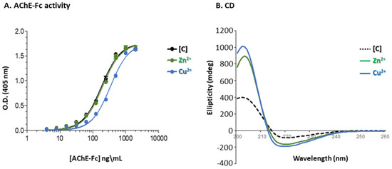 (A). Acetylcholinesterase activity measured by Ellman’s activity assay (see Figure 1) obtained for AChE-Fc purified via Protein A chromatography [C] (black line), [(batho)3:Zn2+] (green line) and [(batho)2:Cu2+] (blue line). (B). Circular dichroism (CD) spectroscopy. Far UV CD spectra of AChE-Fc purified by Protein A chromatography [C] (black dotted line) is compared to AChE-Fc isolated with either the [(batho)3:Zn2+] complex (green line) or [(batho)2:Cu2+] complex (blue line). Protein samples were diluted with PBS to 0.05 mg/mL.