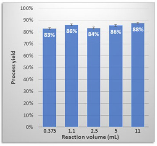 The impact of reaction volume on process efficiency was also evaluated. We found that a 30-fold increase from 0.375 mL to 11 mL required only a proportional increase in the [(batho)3:Zn2+] complex and PEG-6000 (Figure 6). As no reagent adjustments were needed, it may represent a good starting point for further process upscaling.