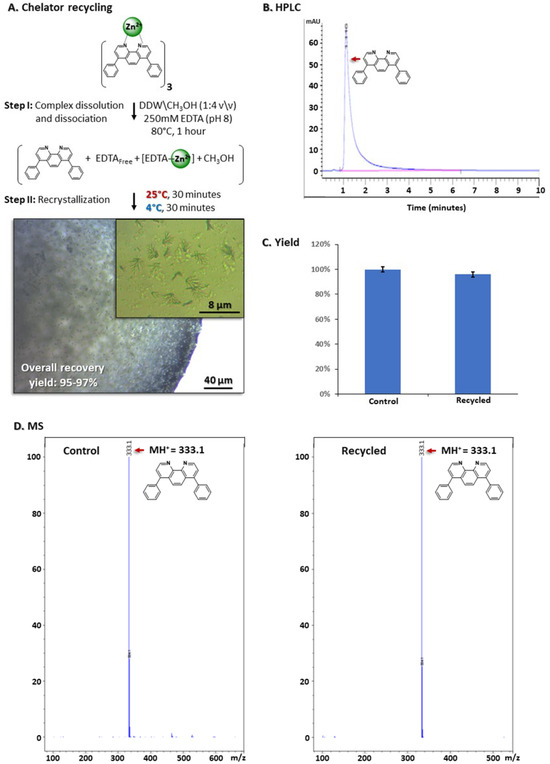 With respect to process economics (as well as to environmental safety), recycling the hydrophobic chelator was considered to be essential; it represents ~85% of all raw material costs. We therefore aimed at developing a rapid, non-chromatographic, cost-effective and simple-to-implement protocol for chelator recycling. We exploited the extremely low water solubility of the batho chelator combined with its fully aromatic structure. These two properties suggested that it would rapidly crystallize from aqueous media due to its highly hydrophobic nature and ability to form π-π interactions acting as stable nucleation centers to support rapid crystal growth. Accordingly, the pellets that remained at the end of the purification process were incubated for an hour at 80 °C with 0.5 mL of a mixture containing DDW/CH3OH (4:1, v/v) that included 250 mM EDTA, pH 8 (Figure 7A). These conditions were expected to dissolve the [(batho)3:Zn2+] complex, as previously demonstrated for the analogous [(batho)3:Fe2+] complex, [52]. This allowed the excess EDTA molecules to compete with batho for Zn2+ binding and to suppress reforming of the [(batho)3:Zn2+] complex. Indeed, colorless crystals were observed following the gradual cooling of the medium from 80 °C to 4 °C and washing of the resulting pellet with DDW (Figure 7A). Mass spectrometry (Figure 7B) and HPLC analysis indicated that the micro-crystals are composed of 97% pure batho (Figure 7B,C), a similar purity level to that determined for pristine, commercial batho crystals. The recycling yield was found to be close to quantitative at (95–97%). These values are obtained by measuring the specific absorption of the [(batho)3:Fe2+] at 533 nm [47] after dissolving the entire amount of recycled chelator with methanol, adding 4 mM FeCl2 in 20 mM NaCl and comparing the measured OD values to those obtained from the total quantity of batho present initially in the system (Figure 7D).