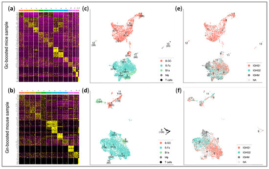 Single-cell phenotypic profiling. Gene expression profiling (scRNA-seq) using 10x Genomics platform and unsupervised cell clustering was performed according to differentially expressed markers (using Seurat). (a,b) Heatmaps of the top 10 differentially expressed genes in each cluster of the Gc-sample and Gn-sample, respectively. (c,d) UMAP visualization of individual cells (each point represents a single barcode, which corresponds to a single cell) in the Gc-sample and Gn-sample, respectively. The plots indicate the cluster numbers as well as the number of cells in each cluster (in brackets). Each cell is colored according to its annotation: B.GC, germinal center B cell; B.Fo, follicular B cells; B1a cells; MΦ, macrophages; and T cells. (e,f) UMAPs indicating cells expressing immunoglobulin heavy chain isotypes (IGHG1, IGHG2, and IGHM) in the Gc-sample and Gn-sample, respectively. NA indicates cells with no BCR information or isotypes represented by less than 1% of the cells.