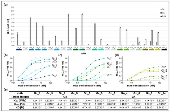 Next, kinetic antigen binding parameters were determined for the six Gc_mAbs and five Gn_mAbs with the highest Bmax and apparent KD values (see above) using biolayer interferometry (BLI). The Kon, Koff, and KD values calculated for each antibody are provided in Figure 4e. The measured binding kinetic parameters indicated a high affinity for all the tested mAbs. The affinities of the Gc_mAbs ranged from 2.1 × 10−9 M to 3.2 × 10−8 M, with mAb Gc_3, Gc_9, and Gc_4 showing the highest affinities and mAb Gc_1 showing the lowest. The KD values of the Gn_mAbs ranged from 6.5 × 10−10 M to 8 × 10−9 M, with mAb Gn_14 and Gn_4 exhibiting sub-M affinities and Gn_8 expressed the lowest affinity. Therefore, the affinities of the mAbs were in line, in most of the cases, to their previously determined binding profiles, particularly in the case of the Gc_mAbs.