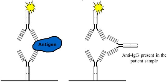 Sandwich immunoassay using chicken IgY antibodies with a specific antigen reaction (left) and a false positive reaction due to anti-IgG antibodies reacting with the mammalian antibody pair (right).