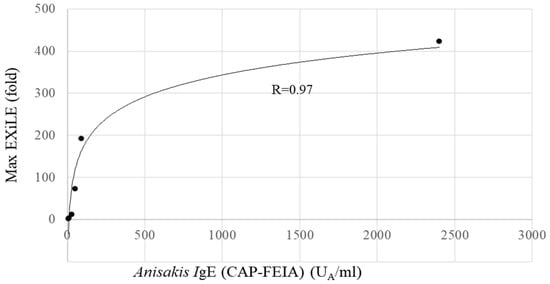 Correlation between Anisakis IgE (CAP-FEIA) and EXiLE in HuRa-40 cells. This figure depicts the results in Table 2 in graphic form through an Excel scatter plot. Logarithmic approximation curve between the CAP-FEIA and EXiLE results obtained with 5 μg/mL of AWP is shown. The R-value was 0.97.