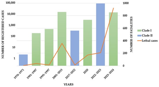 Zoonotic orthopoxviruses pathogenic to humans have been identified in specific geographic and ecological regions across South America, Africa, Eastern Europe, the Middle East, and Asia [4,5,6,7,8]. Recent research indicates a concerning trend of annual increases in cases and an expansion of their geographical distribution [4,9]. Among these viruses, the monkeypox virus (MPXV) has emerged as a particular focus of concern due to its clinical manifestations that resemble those of Variola virus (VARV) infection and its high mortality rate. Currently, four clades of MPXV have been identified (Ia, Ib, IIa, and IIb), with clade I being the most pathogenic and associated with fatality rates of up to 10%. Since the first documented case in the Democratic Republic of the Congo in 1970 [10], MPXV cases have steadily increased and expanded beyond Africa’s borders [11].