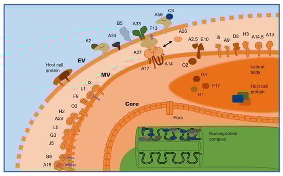 The various stages of MV morphogenesis, including membranogenesis, viral DNA and protein stacking, occur exclusively within specialized membrane compartments known as virus factories. These structures are located near the endoplasmic reticulum and Golgi apparatus and are thought to form an interconnected network with these organelles [57,58,59]. The stabilization of the MV membrane is facilitated by three viral proteins: A14, A17, and D13 [60]. Additionally, a transmembrane redox system, essential for the posttranslational modification of membrane proteins in mature viral particles, is composed of three proteins: A2.5, E10, and G4 [61].
