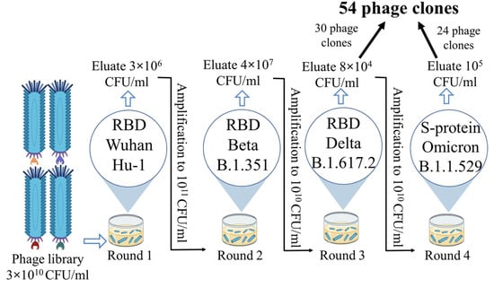 The only difference in each round of biopanning was the target with which the phage clones interacted. Recombinant RBD variants of Wuhan Hu-1, Beta (B.1.351), and Delta (B.1.617.2) were used as targets in the first three rounds. In the fourth round, a recombinant S protein trimer of the Omicron variant (B.1.1.529) was used. Recombinant protein (150 ng per well) was adsorbed onto 96-well plates in a coating buffer (0.1 M NaHCO3) and incubated for 16 h at 4 °C. After incubation, blocking was performed by adding 150 µL of blocking buffer (0.1 M NaHCO3 with 0.5% v/v BSA) and incubating for 1 h at 4 °C. The plate was washed with TBS-T buffer (tris-buffered saline with 0.1% v/v Tween-20). After washing, a phage suspension with a titre of 1 × 1010 CFU/mL (100 µL) was added and incubated for 1 h at room temperature. Following incubation, the wells were washed again with wash buffer, and 100 µL of elution buffer (0.2 M Glycine-HCl) was added to each well and incubated at room temperature for 15 min on a shaker set at 25 rpm. Then, 15 µL of neutralization buffer (1 M Tris-HCl) was added to stop the reaction. The eluates obtained after biopanning were amplified and the nucleotide sequences of individual phage clones were sequenced.