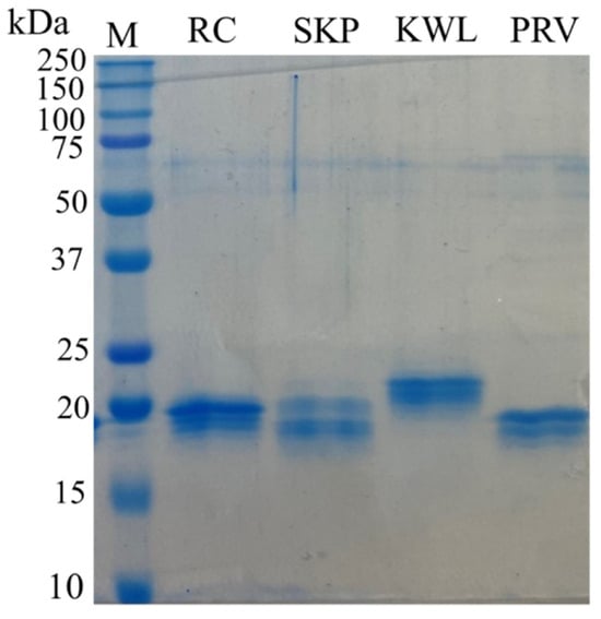 Electrophoretic separation of synthesized nanobodies in 10% SDS-PAGE. Labels: M—molecular weight protein markers with the molecular weight in kDa indicated on the left (Precision Plus Protein™ Dual Xtra Prestained Protein Standards, Bio-Rad, Hercules, CA, USA); RC, SKP, KWL, PRV—purified recombinant nanobodies.
