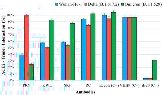 Binding of ACE2 to recombinant SARS-CoV-2 S protein trimers upon inhibition of interaction by nanobodies. The 100% interaction level is considered to be the signal of direct binding between the trimer and ACE2. Notations: PRV, KWL, SKP, RC—lysates of nanobody producers; E. coli (C−)—negative control producer, lysate of cells transformed with the pET21a(−) plasmid; VHH9 (C−)—nanobody specific to HIV-1, negative control of a heterologous nanobody; iB20—broad-neutralizing human monoclonal antibody against SARS-CoV-2 [32], positive control. One-way ANOVA showed statistically significant differences in the inhibition of ACE2 binding among nanobodies for each SARS-CoV-2 variant (Wuhan, Delta, and Omicron) with p < 0.0001.