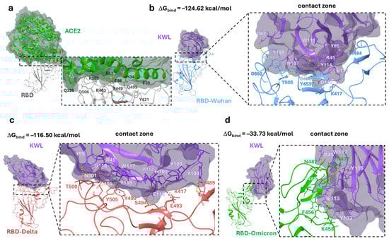 The positioning of the KWL nanobody relative to the Omicron RBD in the KWL–RBD–Omicron complex differs significantly from the other complexes. In fact, the amino acid residues of the CDR loops of the nanobody interact with only one of the three contact zones of the RBD–ACE2 complex (Figure 4d). Hydrogen bonds are observed between the following pairs of amino acids: R45–N487, W117–Y489, Y116–N477, and E113–K458. A salt bridge was observed between E113 and K458, and π–π stacking interactions between the aromatic rings Y103 and F456. The positioning of the nanobody relative to the antigen affects the value of the binding free energy (ΔGbind), which is a measure of the thermodynamic stability of molecular interactions (Figure 4). The KWL–RBD–Wuhan complex was found to be the most thermodynamically stable, with the lowest binding free energy. The KWL–RBD–Delta complex is considered slightly less stable. The binding of the nanobody to the receptor-binding domain of the Omicron variant is characterized by the highest binding energy, indicating a less stable (from a thermodynamic perspective) state of the system.