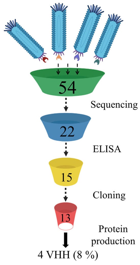 From the phage display nanobody library (biological titre 3 × 1010 CFU/mL), generated based on the immune repertoire of a llama immunized with the Wuhan RBD, 30 phage clones were selected after three rounds of biopanning. Recombinant RBD of the SARS-CoV-2 spike protein variants Wuhan Hu-1, Beta (B.1.351), and Delta (B.1.617.2) were sequentially used as targets in the three rounds of selection. An additional fourth round was performed using the recombinant S protein trimer of the Omicron (B.1.1.529) variant, and 24 additional phage clones were selected. In total, 54 phage clones were selected from the phage repertoire in the library (Figure 1).