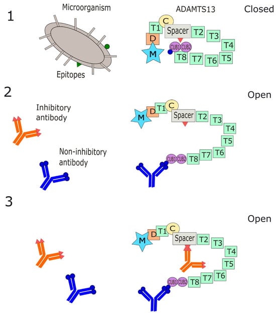 - Halkidis, K.; Zheng, X.L. ADAMTS13 conformations and mechanism of inhibition in immune thrombotic thrombocytopenic purpura. J. Thromb. Haemost. 2022, 20, 2197–2203. [Google Scholar] [CrossRef]
