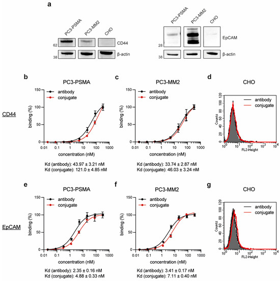 Cell binding of the antibodies and antibody dye conjugates. (a) CD44 and EpCAM expression of the target cells. Concentration-dependent binding of the antibody CD44T120C/D265C and the conjugate CD44T120C/D265C-WB692-CB2 to (b) PC3-PSMA and (c) PC3-MM2 cells; (d) binding to CD44 negative CHO cells at a saturation concentration of 20.8 nM. Concentration-dependent binding of the antibody EpCAMT120C/D265C and the conjugate EpCAMT120C/D265C-WB692-CB2 to (e) PC3-PSMA and (f) PC3-MM2 cells; (g) binding to EpCAM negative CHO cells at a saturation concentration of 20.8 nM. Mean values ± SD of three independent experiments. Abbreviation: Kd, dissociation constant.