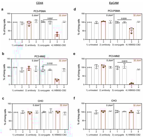 PIT of PC or PCSC-like cells with the conjugates CD44T120C/D265C-WB692-CB2 and EpCAMT120C/D265C-WB692-CB2. (a) Viability of PC3-PSMA, (b) PC3-MM2 or (c) CHO cells 24 h after PIT incubated with 10 µg/mL CD44T120C/D265C, 10 µg/mL CD44T120C/D265C-WB692-CB2, free dye or medium (untreated control), and irradiation with a light dose of 32 J/cm2. Control cells were not irradiated (0 J/cm2). Viability of (d) PC3-PSMA, (e) PC3-MM2 and (f) CHO cells 24 h after PIT incubated with 10 µg/mL EpCAMT120C/D265C, 10 µg/mL EpCAMT120C/D265C-WB692-CB2, free dye or medium (untreated control), and irradiated with a light dose of 32 J/cm2. Control cells were not irradiated (0 J/cm2). Mean values ± SD of three independent biological experiments. Statistical analyses by Student’s t-test (unpaired, parametric with Welch’s correction).