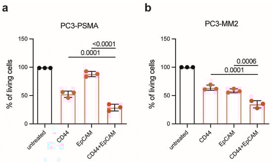 Combined PIT of PC cells and PCSC-like cells. (a) Viability of PC3-PSMA cells and (b) PC3-MM2 cells 24 h after PIT with 10 µg/mL CD44T120C/D265C-WB692-CB2 or EpCAMT120C/D265C-WB692-CB2 alone or in combination, and a light dose of 16 J/cm2. Mean values ± SD of three independent biological experiments. Statistical analyses were performed using one-way ANOVA, followed by Tukey’s multiple comparison test for post hoc analysis, with an adjusted significance level of p = 0.05.