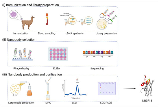 Schematic presentation of nanobody preparation. There are three main phases: (i) immunization and library preparation consisting of llama immunization, drawing blood, extraction of mRNA and cDNA synthesis, amplification of the VHH genes, insertion into phage display vectors, and library creation; (ii) nanobody selection consisting of library enrichment using phage display, i.e., biopanning, nanobody selection with ELISA, and sequencing to identify the nanobodies with complete sequences; and (iii) nanobody production and purification consisting of large-scale production of selected nanobodies in E. coli host cells, purification with IMAC and SEC, and validation of the purified nanobodies with SDS-PAGE. Image was created with BioRender.com.