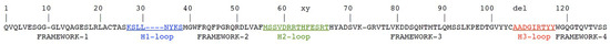 Amino acid sequence of NB3F18. Framework regions 1, 2, 3, and 4 are shown in black. Hypervariable loops H1-, H2-, and H3-loop are underlined and given in blue, green, and red, respectively. The amino acids of the CDR3 (i.e., H3) are in alphabetical order. Numbering is according to the IMGT information system. ‘xy’ was included in the numbering as the H2-loop is longer than usual due to 2 amino acid insertions, while the H3-loop is relatively shorter than most camelid H3-loops as indicated by ‘del’.