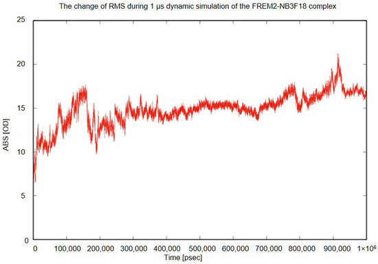 Based on the identified NB3F18 interaction with 126 amino-acid residues (F2371-A2393) of FREM2, we modeled their complex, which appeared stable throughout a 1000 ns molecular dynamics simulation run. This result corroborated the affinity determined by SPR. A relatively long, 1000 ns in silico molecular dynamic simulation experiment suggested a possible stable interaction between NB3F18 and the 126-amino-acid-residue-long FREM2 fragment.