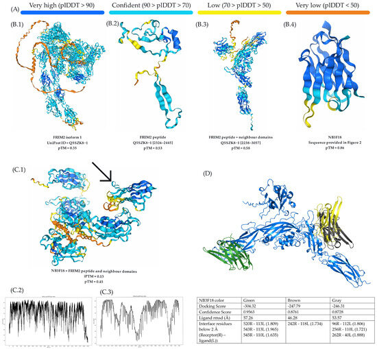 Modeling the FREM2 protein and NB3F18 and their binding predictions using AlphaFold3.0. (A) Color scale of the predicted local distance difference (plDDT) used to assess per-residue prediction confidence. This scale applies to the 3D structures shown in B.1–B.4 and C.1. (B) AlphaFold3.0 predictions of FREM2 and NB3F18 with associated pTM scores. (B.1) represents the full-length FREM2 isoform 1 protein sequence obtained from UniProt. (B.2,B.3) are modeling predictions for subsections of the full-length FREM2 protein shown to bind with NB3F18 in vitro. (C) AlphaFold3.0 predictions of interactions between the NB3F18 nanobody and the FREM2 peptide, including neighboring regions with the highest pTM scores. (C.1) shows the 3D structure of NB3F18 and the top-predicted FREM2 sequence. The arrow indicates the NB3F18 sequence. (C.2) represents the plDDT scores for the FREM2 peptide and neighboring regions following binding with NB3F18. (C.3) represents the plDDT scores for the NB3F18 model after binding to the FREM2 peptide and neighboring regions. (D) Predicted docking sites between NB3F18 and the FREM2 peptide (including neighboring regions) generated by HDOC. The table below the prediction model shows the docking scores, confidence values, ligand root mean square deviation (RMSD) scores, and interface residue pairs below 2 Å for the top 3 NB3F18 nanobody binding sites.