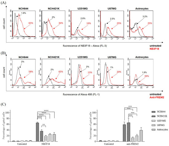 Cellular specificity was quantified by flow cytometry. The use of controls allowed us to determine the baseline autofluorescence of the cells and remove it from the analysis. As presented in Figure 7A, NB3F18 binds 65.36% and 36.47% of the gated glioblastoma stem cells NCH644 and NCH421K, respectively. It also binds 19.04% of the U251MG, 25.25% of the U87MG, and 25.35% of the astrocytes (Figure 7A). This suggests that NB3F18 binds to glioblastoma stem cells to a higher extent than to differentiated glioblastoma cells. For comparative analysis, we tested the binding specificity of an anti-FREM2 antibody which showed similar results (Figure 7B). The anti-FREM2 antibody binds to 58.79% of the NCH644, 65.82% of the NCH421K, 13.10% of the U251MG, 20.35% of the U87MG, and 39.47% of the astrocytes. Results of the biological replicates are shown in Table 2, and the statistical analysis is graphically presented in Figure 7C.