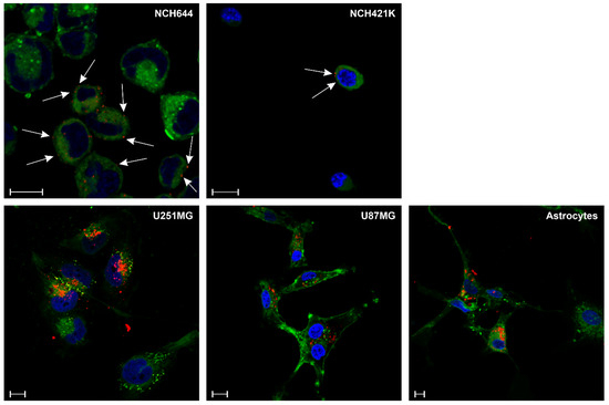 Immunofluorescent analysis of the localization of NB3F18-546Alexa on different glioblastoma cells and astrocytes. Red—NB3F18-546Alexa; green—membrane-staining dye BioTracker; blue—DAPI. In NCH644 and NCH421K glioblastoma stem cells, the signal from NB3F18-546Alexa was seen also on the cell surface (white arrows). This is not observed in the other analyzed cells. Scale bars correspond to 10 μm.