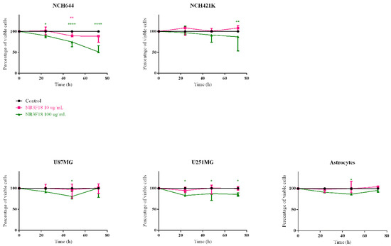 Next, we tested whether NB3F18 has a cytotoxic effect for glioblastoma cells using a WST-1 colorimetric assay. We determined the cytotoxicity of 10 µg/mL and 100 µg/mL NB3F18 on glioblastoma cells and astrocytes over three different time periods: 24 h, 48 h, and 72 h (Figure 10). The greatest negative effect was observed on the cell viability of NCH644 after 48 h and 72 h of incubation when using 100 µg/mL NB3F18. Cell viability was reduced to 84.7% and 55.46%, respectively. Incubation with 100 µg/mL NB3F18 reduced the cell viability of NCH421K to 76.41%. NB3F18 affected the growth of the other studied cell lines to a much lesser extent (Table 3). Importantly, NB318 did not drastically affect the viability of astrocytes even after prolonged incubation.