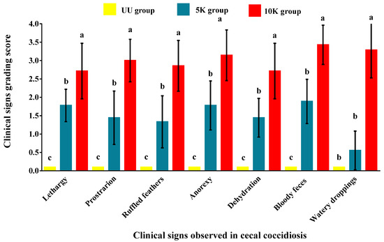 Clinical signs grading scores were recorded during the prepatent and patent periods after primary immunization of hybrid pullets at 8 weeks of age either with 5000 or 10,000 sporulated oocysts of Eimeria tenella. An unimmunized-uninfected (UU) control group was included in this study. The bars indicate median values for each treatment group. Median points are displayed in the figure represented by the arithmetic mean (±SD) in order to achieve the best comprehension of the visualized data. Different letters (a, b, and c) next to each bar indicate statistical differences (p < 0.05). The 5K and UU groups (n = 9), and 10K group (n = 7).