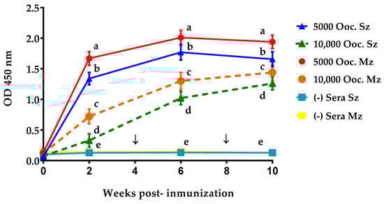 Comparison of the time course of the antibody response to sporozoite (Sz) and merozoite (Mz) antigens in birds orally primed with 5000 or 10,000 oocysts of E. tenella at eight weeks of age. The response to both antigens from unimmunized control birds (-) is also shown. The arrows indicate the time of boosted infections (↓). At each blood sampling, the arithmetic means (±SD) of optical densities of serums (1:100) collected from all birds in each group are shown (n = 9). Line plots with different letters (a, b, c, d, or e) within the graph indicate significant differences at p < 0.05.