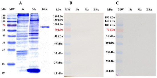 Proteins from the sporozoite (Sz) and second-generation merozoite (Mz) of the wild-type E. tenella strain were resolved on 12% SDS-PAGE and stained with Coomassie Brilliant Blue (A). The pooled sera (n = 6) of preimmunize (B) and unimmunized-uninfected control birds (C) did not show any reactivity against either of the asexual zoite stages of E. tenella (Mw = protein molecular weight marker; BSA = bovine serum albumin).