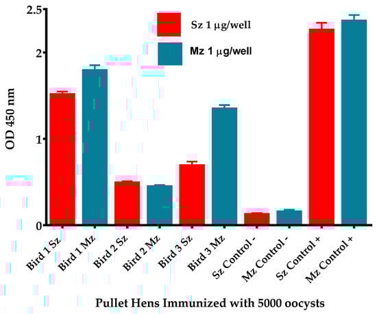 Antisera reactivity to Sz and Mz antigens was assessed by indirect ELISA, as previously described by Juárez-Estrada et al. [34]. Briefly, 96-well microtiter plates (MaxiSorb, Nunc, Roskilde, Denmark) were coated overnight at 4 °C with 1 μg of sporozoite or 2nd-generation merozoite antigen in 100 μL of carbonate buffer (0.1 M sodium bicarbonate and 0.1 M sodium carbonate buffer, pH 9.6). Control wells were incubated with 100 μL of carbonate buffer. After four washes on a shaker with a saline solution (S) (120 mM NaCl, 25 mM Tris-HCl, pH 7.9) containing 1% Tween 20 (ST), non-specific binding sites were blocked by incubating for 1 h at 37 °C in a static oven with 110 μL of 5% skim milk in ST (STM). Serum diluted 1:100 in STM was added to the test and control wells after four ST washes, and both were then incubated for 1 h at 37 °C. Each plate included negative control serum samples from unimmunized-uninfected pullets. After incubation, the plates were washed four times with ST and then incubated with their respective secondary antibody peroxidase conjugate diluted 1:2000 with STM (Rabbit Anti-Chicken IgY IgG) (Jackson ImmunoResearch Laboratories, Inc., West Grove, PA, USA). Following 1 h at 37 °C, the plates were washed four times. The enzymatic reaction was developed by adding 100 μL of OPD chromogen (o-phenylendiamine dihydrochloride SIGMA, St. Louis, MO, USA) at 5 μg/10 mL in citrate buffer (0.1 M citric acid, 0.1 M sodium citrate p.H. 4.5, and 20 μL of 30% hydrogen peroxide) for 10 min on a shaker in the dark. An ELISA microplate spectrophotometer (Epoch, BioTek, Winooski, VT, USA) was used to measure the absorbance produced by substrate hydrolysis at 450 nm.