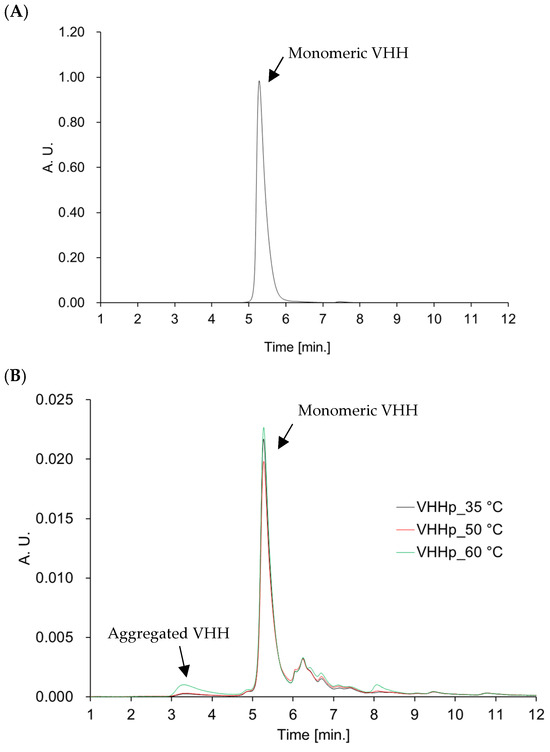 The aggregation rate of the anti-HSA-VHH in the VHHps was analyzed using size exclusion chromatography (SEC) with an ACQUITY UPLC H-Class PLUS Bio System (Waters, Milford, MA, USA). The analysis was performed using an ACQUITY Premier Protein SEC column (250 Å, 1.7 μm, 4.6 × 150 mm, Waters) according to the manufacturer’s instructions.