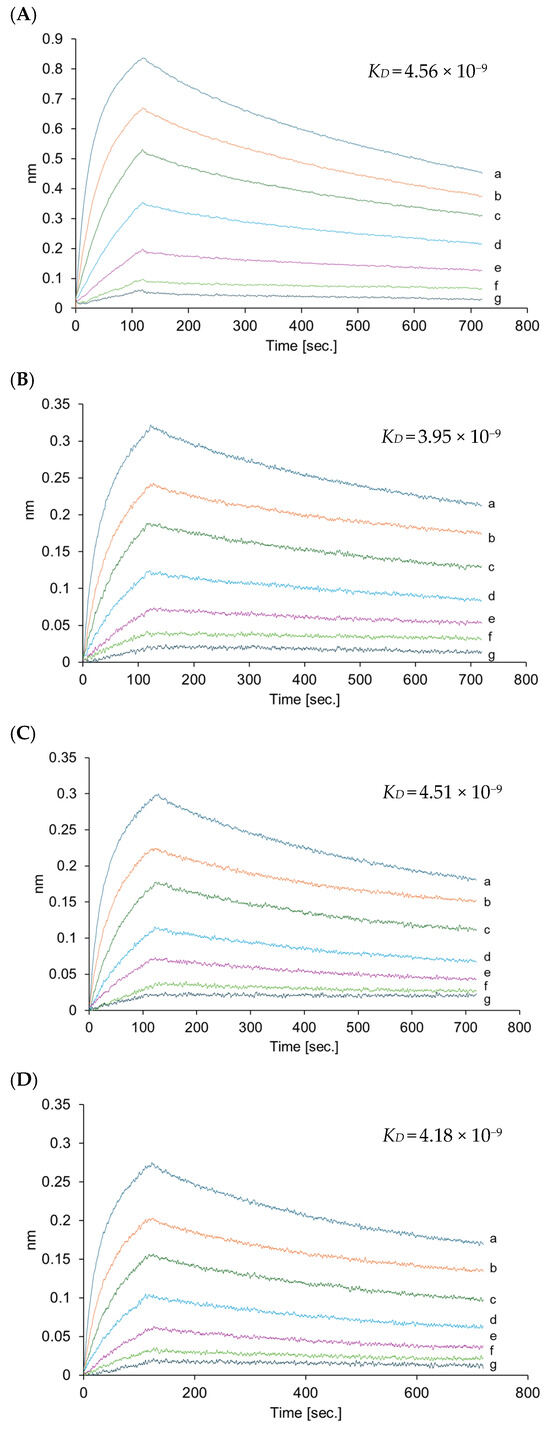 The bio-layer interferometry results for the VHHs. Each graph shows the binding kinetics of VHHs. (A) Native VHH, (B) VHHp (35 °C), (C) VHHp (50 °C), and (D) VHHp (65 °C). (a–g) of each graph indicates the binding capacities at different VHH concentrations: (a) 200, (b) 100, (c) 50, (d) 25, (e) 12.5, (f) 6.2, and (g) 3.1 nmol/L in the bio-layer interferometry analysis.