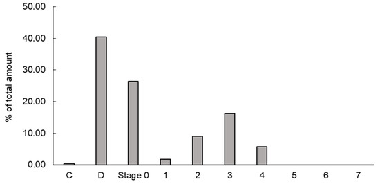 Deposition patterns of VHHps in the cascade impactor (C, capsule; D, device). The cascade impactor installs stages 0–8. Deposition ratios of VHHps were calculated by the deposition amounts of VHHps at each stage.