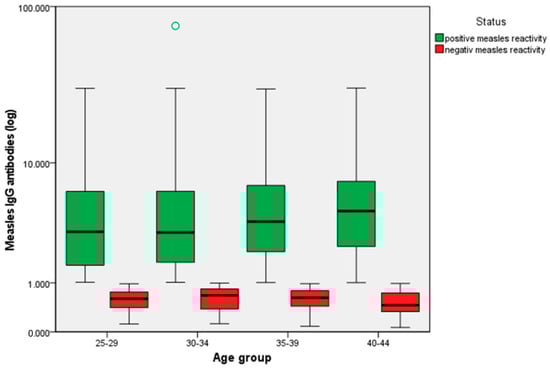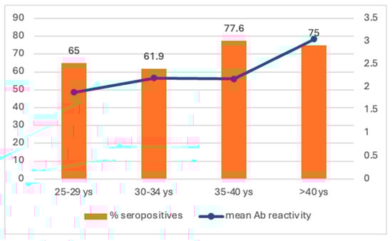 Measles seroprevalence in pregnant women. The mean age of the enrolled pregnant women was 31.5 ± 5.7 years, and the mean gestational age was 21.8 ± 9.8 weeks. Only 68.4% of pregnant women had IgG measles antibodies, with a mean reactivity value of 2595 ± 1438. There is no significant difference between the seropositive and seronegative women according to the mean age (31.8 ± 0.3 years vs. 31.2 ± 0.3 years, p = 0.22) or urban/rural residence (70.5% vs. 67.7%, p = 0.3). The seropositivity rate is significantly higher for women aged > 40 years (75% vs. 65% in younger women, p = 0.018). The mean reactivity of measles antibodies in pregnant women has a significant upward trend by age groups (from 2.28 ± 1.39 [95% CI 1.98–2.56] in those aged 25–29 years to 3.05 ± 1.75 [95% CI 2.38–3.75] in those aged > 40 years, p = 0.037), with p < 0.05 considered statistically significant and the corresponding 95% confidence intervals (95% CI) estimated (Figure 3).