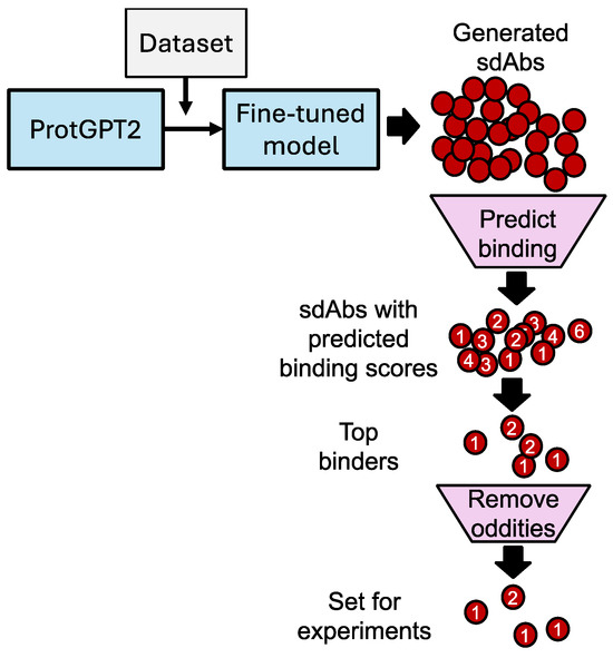 Generative AI can accelerate the discovery and design of sdAbs with high specificity and affinity for selected antigens. The standard approach, utilizing animal immunization, can take on the order of weeks or months to obtain new antibodies against a target antigen. Our described process to design novel sdAbs takes approximately 24 h (using an Nvidia RTX 3070 GPU (Nvidia, Santa Clara, CA, USA) to arrive at a selected set of candidate sdAb sequences to produce. However, it is important to note that the more time-consuming, traditional methods of sdAb discovery are required for the function of these new generative AI-based techniques, as a supply of sequences that can be utilized not only for fine-tuning generative models, but also for the major dependence that state-of-the-art protein structure prediction models have on multisequence alignments of natural sequences and experimentally determined structures. Our ProtGPT2 model was fine-tuned using 245 sdAb sequences, including 62 known alphavirus-binding sdAbs (details provided in the Methods section). Augmentation of the fine-tuning set was found to be necessary, as the set of 62 alphavirus-binding examples was found to be insufficient to generate sdAb-like sequences. Using the fine-tuned model, 599 unique sequences were generated. This set of unique potential sdAbs was shown to have an amino acid frequency distribution that was close to that of the training set (Figure S2) once parameter optimization was performed. These sequences then underwent further filtering. (Our schematic for this process is shown in Figure 1).