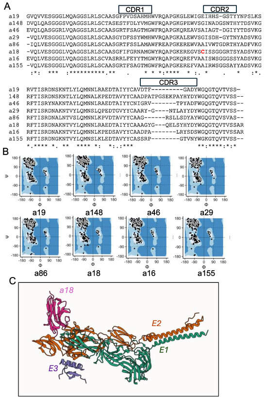 Generated sequences and structures of select sdAbs. (A) Sequence alignment. Alignment was performed using Clustal Omega [26]. “*” indicates amino acids with perfect homology; “:” indicates high homology; “.” indicates low homology. CDR regions are defined using the IMGT definitions. Unpaired cysteine is highlighted in red. Protein sequences shown are what was produced. (B) Ramachandran plots for each of the sdAbs, modeled in complex with VEEV E2 glycoprotein. Colors of points are indicative of whether the phi–psi angle is part of the sdAb or E2 (white for sdAb and black for E2). Shape indicates whether the phi–psi angle falls within the normal range or is an outlier (circle for normal and triangle for outliers). (C) Protein–protein interaction. Predicted structure of representative sdAb a18 (pink), with E1 (green), E2 (orange), and E3 (purple) as ribbon models.