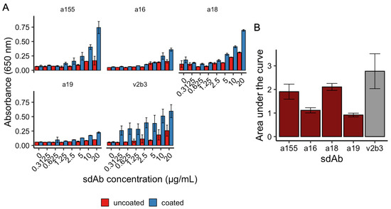 ELISA. ELISAs of four sdAbs (V2B3 as positive control) with readings taken at 650 nm. (A) a155, a16, a18, a19, and V2B3 were evaluated for binding to VEEV TC-83 at a range of concentrations from 20 to 0.3125 µg/mL in uncoated or coated wells. (B) Area under the curve was calculated for each dose response. a155, a16, a18, and a19 (red) plotted against V2B3 (gray). Bars indicate the means of ≥3 replicates and error bars indicate standard deviations.